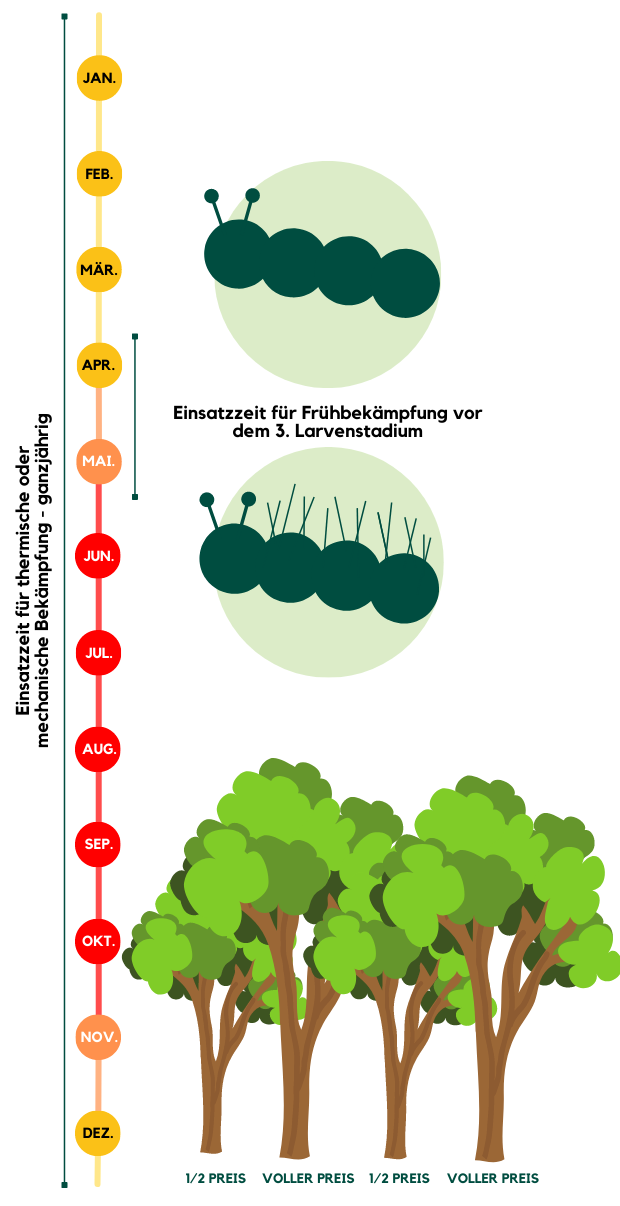 Die Frühbekämpfung sollte vor der dritten Phase des Larvenstadiums angewandt werden, denn ab diesem Zeitpunkt entwickelt die Raupe des Eichenprozessionsspinners ihre Brennhaare die für Mensch und Tier gesundheitsschädlich sind und das Risiko für allergische Reaktionen erhöht. Ab diesem Zeitpunkt ist eine Früh Bekämpfung noch möglich aber verfehlet ihren zweck denn die Brennhaare können noch Jahrelang aktiv sein.
